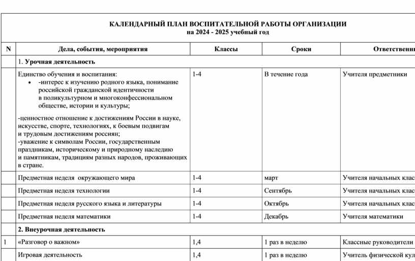 КАЛЕНДАРНЫЙ ПЛАН ВОСПИТАТЕЛЬНОЙ РАБОТЫ ОРГАНИЗАЦИИ на 2024 - 2025 учебный год |