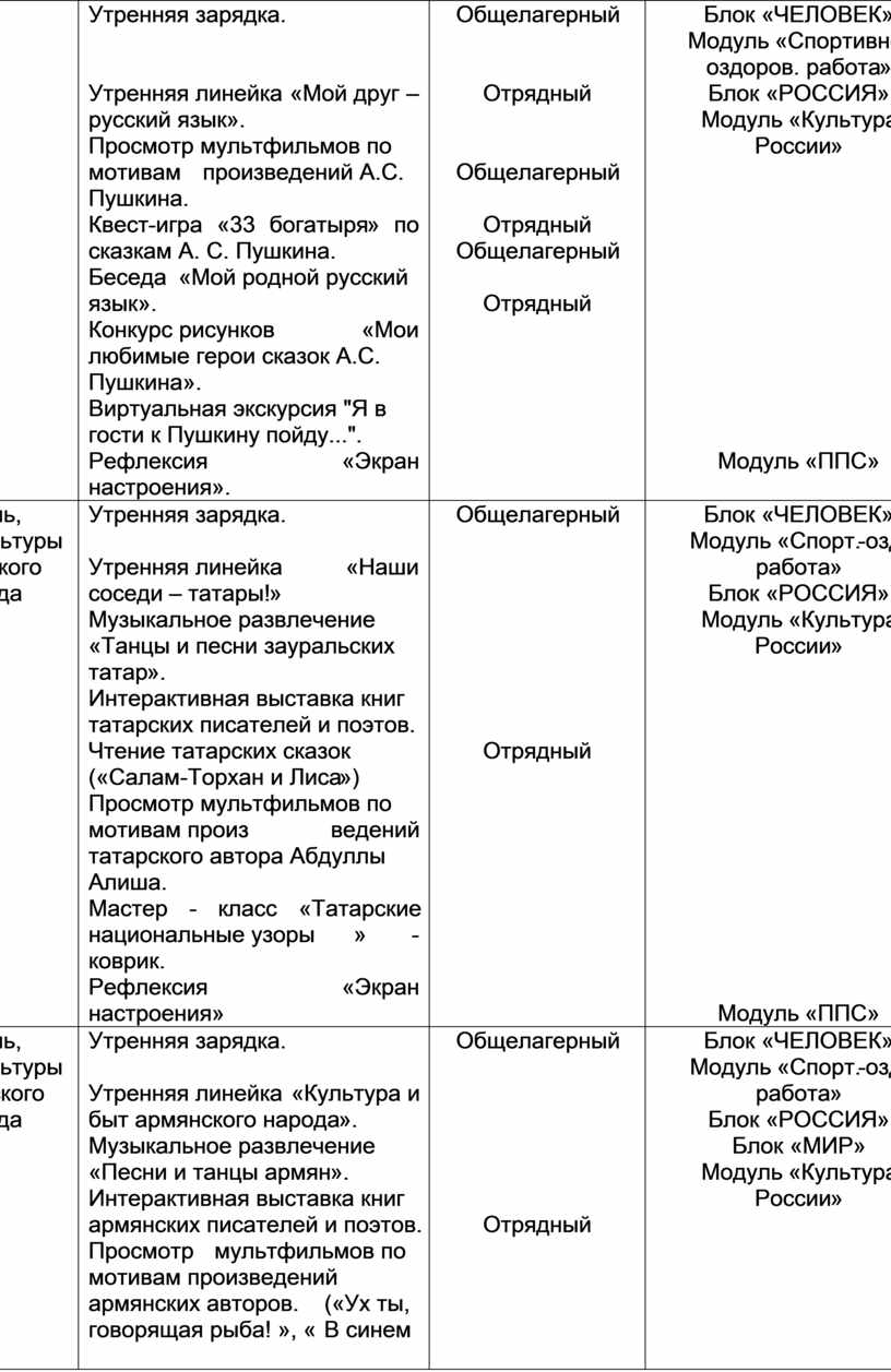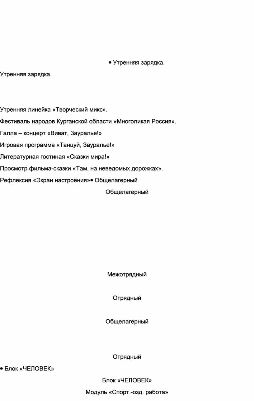 Утренняя линейка «Творческий микс». Фестиваль народов Курганской области «Многоликая Россия». Галла – концерт «Виват, Зауралье!» Игровая программа «Танцуй, Зауралье!» Литературная гостиная «Сказки мира!» Просмотр фильма-сказки «Там, на неведомых дорожках». Рефлексия «Экран настроения» |