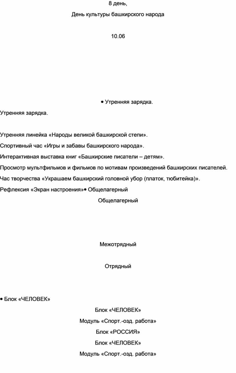 Утренняя линейка «Народы великой башкирской степи». Спортивный час «Игры и забавы башкирского народа». Интерактивная выставка книг «Башкирские писатели – детям». Просмотр мультфильмов и фильмов по мотивам произведений башкирских писателей. Час творчества «Украшаем башкирский головной убор (платок, тюбитейка)». Рефлексия «Экран настроения» |