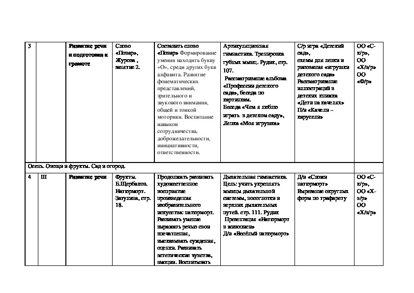 В материала представлен план основанный на тематике с ориентировкой на осенний сезон и праздники. в плане представлена как непосредственно-образовательная деятельность с детьми старшего дошкольного возраста, так и совместная, самостоятельная деятельность. Для созднаия системы работы по той или иной теме предлагаются игры и упражнения.