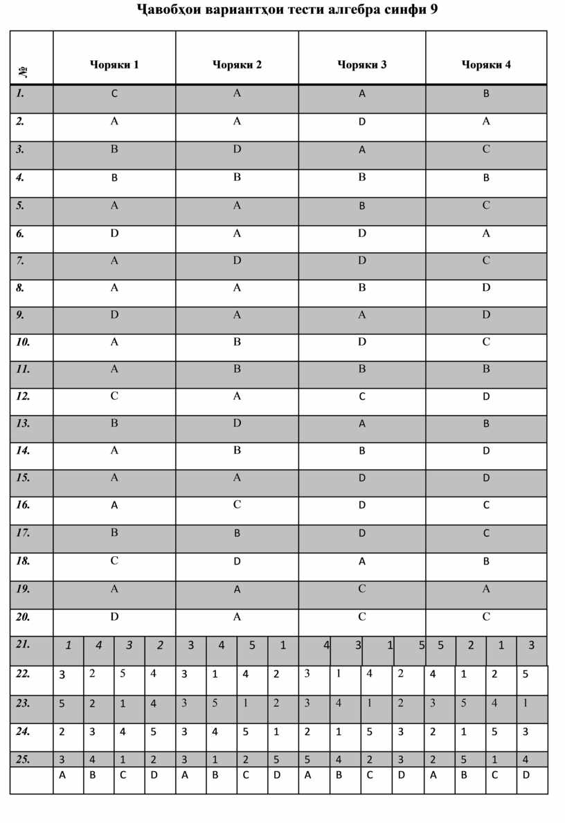 Ҷавобҳои вариантҳои тести алгебра синфи 9