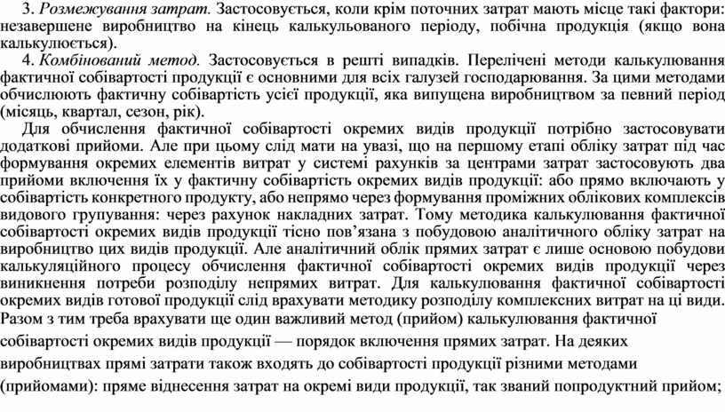 4. Комбінований метод. Застосовується в решті випадків. Перелічені методи калькулювання фактичної собівартості продукції є основними для всіх галузей господарювання. За цими методами обчислюють фактичну собівартість усієї продукції, яка випущена виробництвом за певний період (місяць, квартал, сезон, рік).