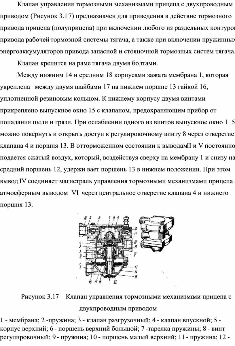 Клапан управления тормозными механизмами прицепа с двухпроводным приводом (Рисунок 3.17) предназначен для приведения в действие тормозного привода прицепа (полуприцепа) при включении любого из раздельных контуров привода рабочей тормозной системы тягача, а также при включении пружинных энергоаккумуляторов привода запасной и стояночной тормозных систем тягача.