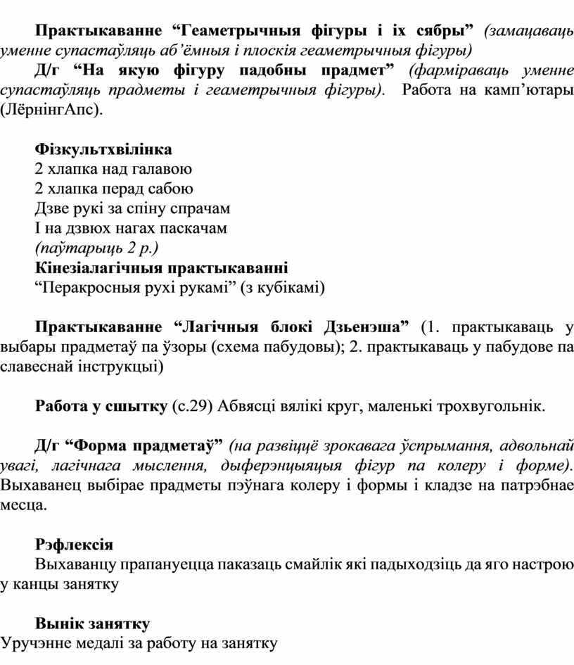 Задачы: фарміраваць уяўленні пра формы навакольных прадметаў; складаць прадметныя выявы па ўзору (з геаметрычных фігур); суадносіць рознародныя прадметы па форме (падобныя на трохвугольнік, круг, квадрат); замацаваць уменне суадносіць колькасць прадметаў з паказам колькасці на пальцах і лічбай (у межах 3);