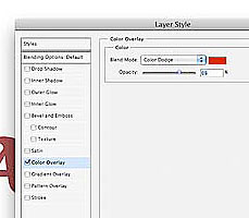 Шаг 3. На Панели Слоев (Panel Layers) выбираем Layer Style (Стиль слоя), значок находится в нижней части Панели. В появившемся окошке щелкаем на Color Overlay (Наложение цвета).