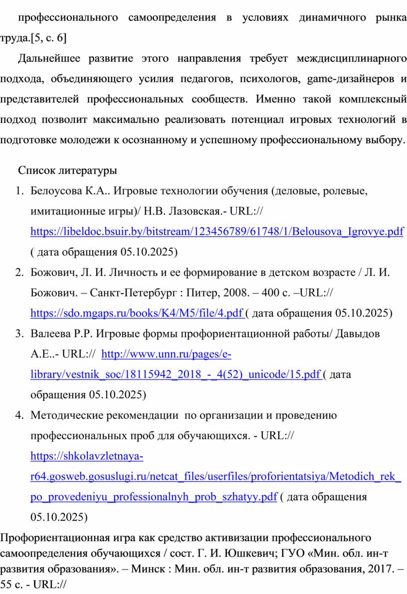 5. Профориентационная игра как средство активизации профессионального самоопределения обучающихся / сост. Г. И. Юшкевич; ГУО «Мин. обл. ин-т развития образования». – Минск : Мин. обл. ин-т развития образования, 2017. – 55 с. - URL:// https://moiro.by/files/00206/obj/110/133553/doc/Профориентационная%20игра.pdf ( дата обращения 05.10.2025) 231