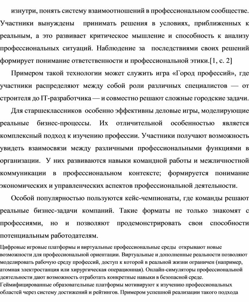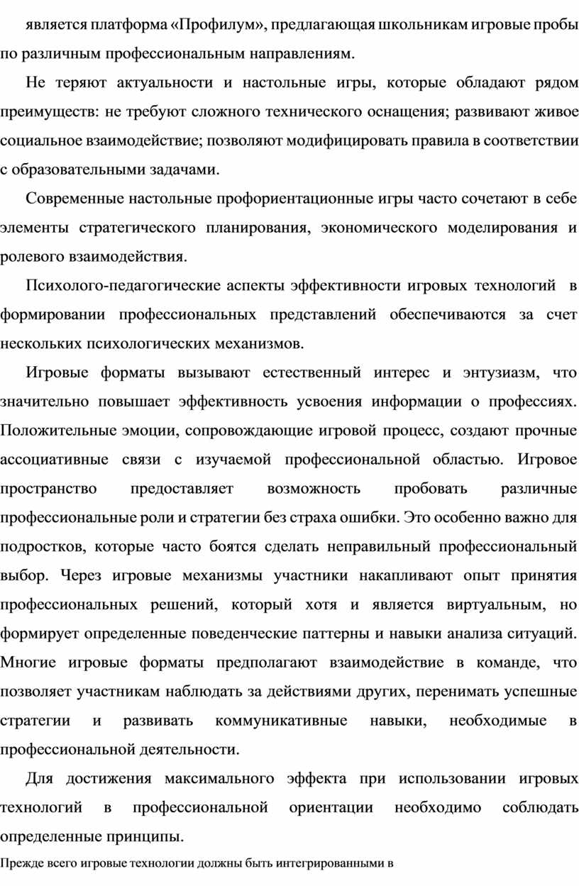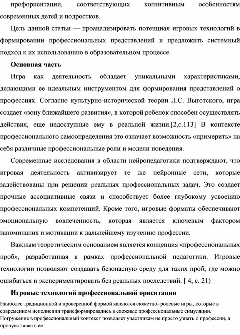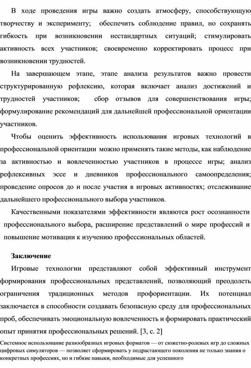 Важным теоретическим основанием является концепция «профессиональных проб», разработанная в рамках профессиональной педагогики. Игровые технологии позволяют создавать безопасную среду для таких проб, где можно ошибаться и экспериментировать без реальных последствий. [ 4, с. 21)