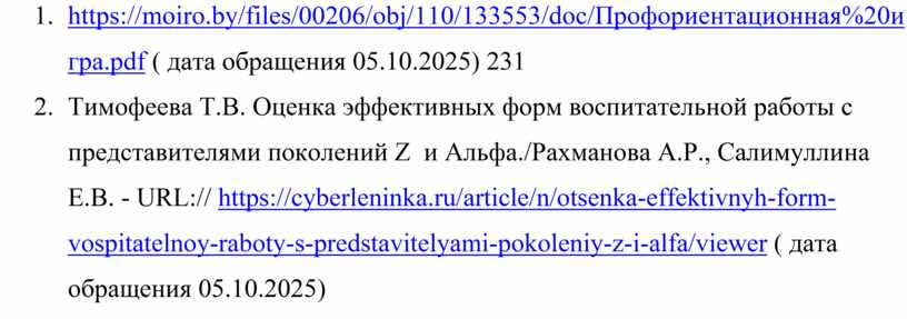 6. Тимофеева Т.В. Оценка эффективных форм воспитательной работы с представителями поколений Z и Альфа./Рахманова А.Р., Салимуллина Е.В. - URL:// https://cyberleninka.ru/article/n/otsenka-effektivnyh-form-vospitatelnoy-raboty-s-predstavitelyami-pokoleniy-z-i-alfa/viewer ( дата обращения 05.10.2025)