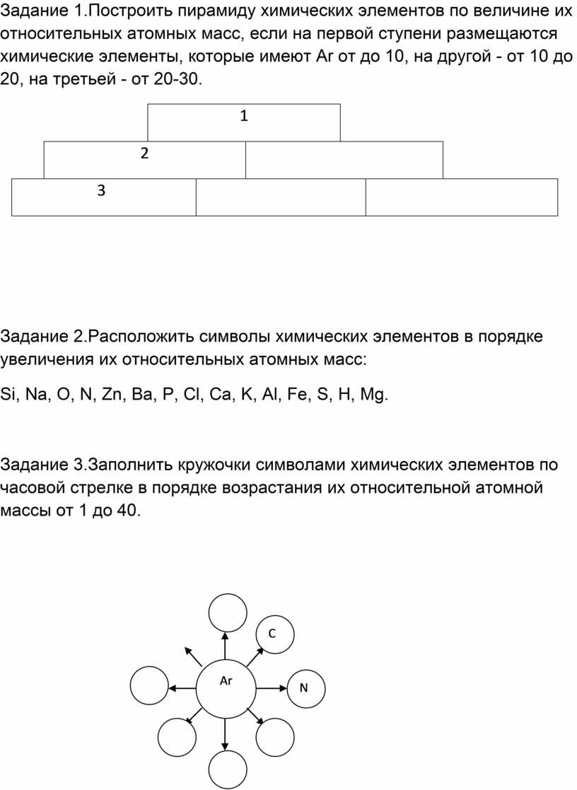 Задание 1.Построить пирамиду химических элементов по величине их относительных атомных масс, если на первой ступени размещаются химические элементы, которые имеют Ar от до 10, на другой - от 10 до 20, на третьей - от 20-30.