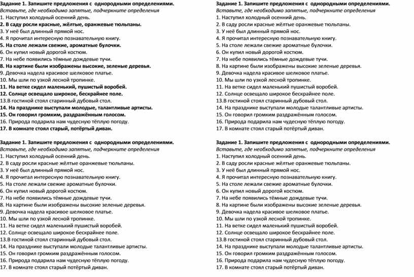 Задание 1. Запишите предложения с однородными определениями. Вставьте, где необходимо запятые, подчеркните определения