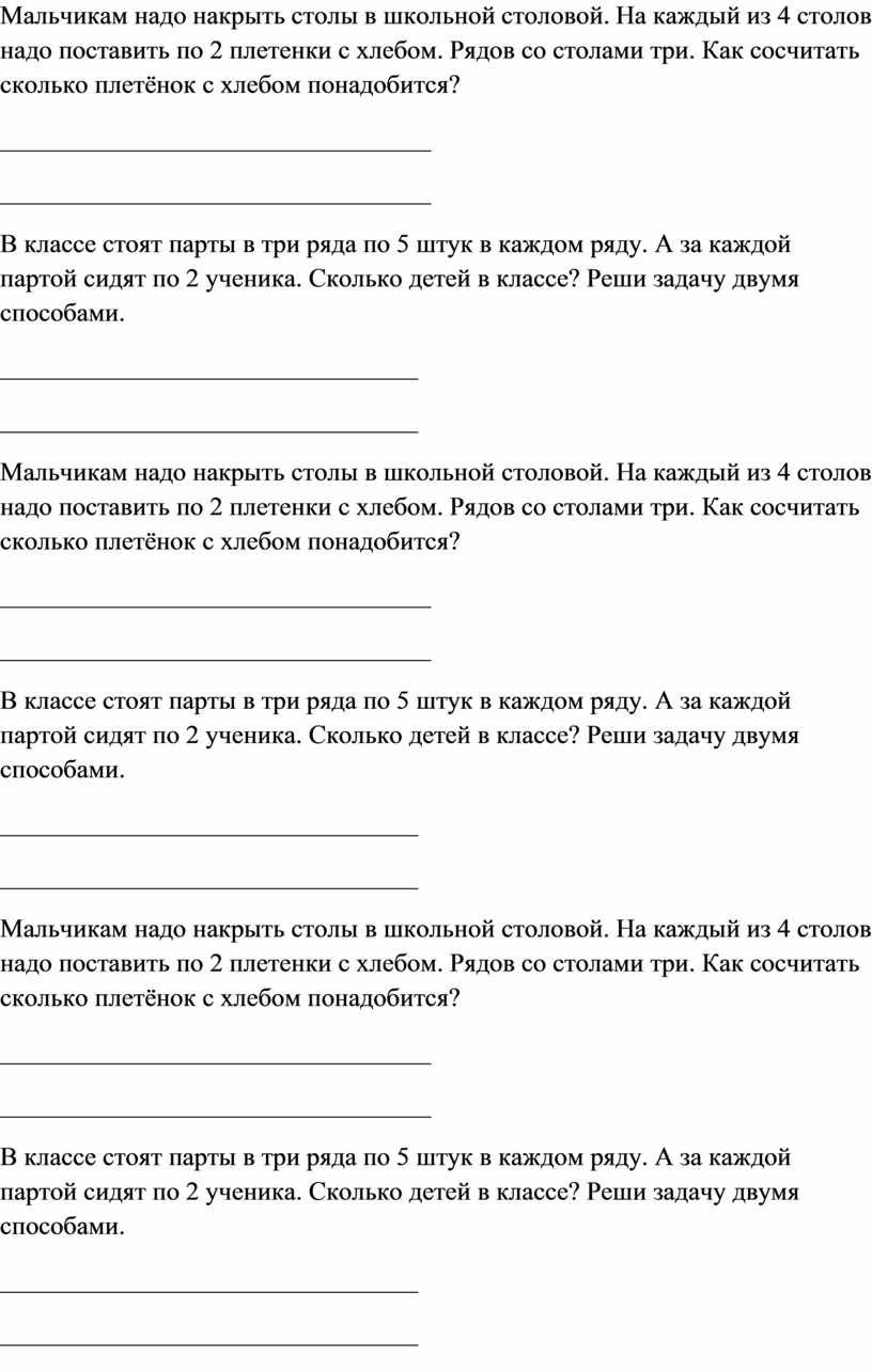 Мальчикам надо накрыть столы в школьной столовой. На каждый из 4 столов надо поставить по 2 плетенки с хлебом. Рядов со столами три. Как сосчитать сколько плетёнок с хлебом понадобится?