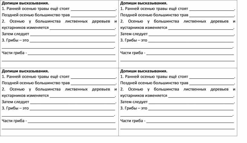 Допиши высказывания. 1. Ранней осенью травы ещё стоят ____________________. Поздней осенью большинство трав ____________________. 2. Осенью у большинства лиственных деревьев и кустарников изменяется _____________________________. Затем следует ______________________________________. 3. Грибы – это ______________________________________ __________________________________________________. Части гриба - _______________________________________ ___________________________________________________