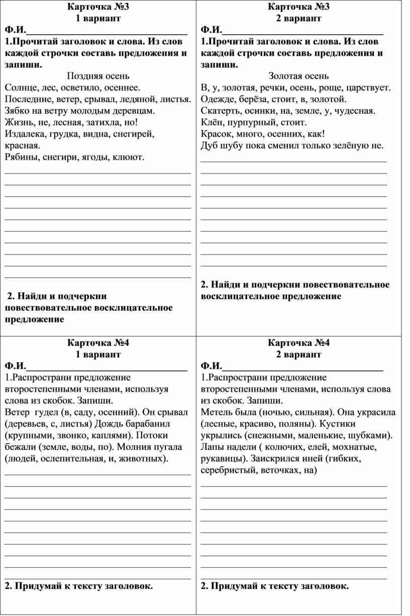 Карточка №3 2 вариант Ф.И.________________________________ 1.Прочитай заголовок и слова. Из слов каждой строчки составь предложения и запиши. Золотая осень В, у, золотая, речки, осень, роще, царствует. Одежде, берёза, стоит, в, золотой. Скатерть, осинки, на, земле, у, чудесная. Клён, пурпурный, стоит. Красок, много, осенних, как! Дуб шубу пока сменил только зелёную не. _____________________________________ _____________________________________ _____________________________________ _____________________________________ _____________________________________ _____________________________________ _____________________________________ _____________________________________ _____________________________________ _____________________________________