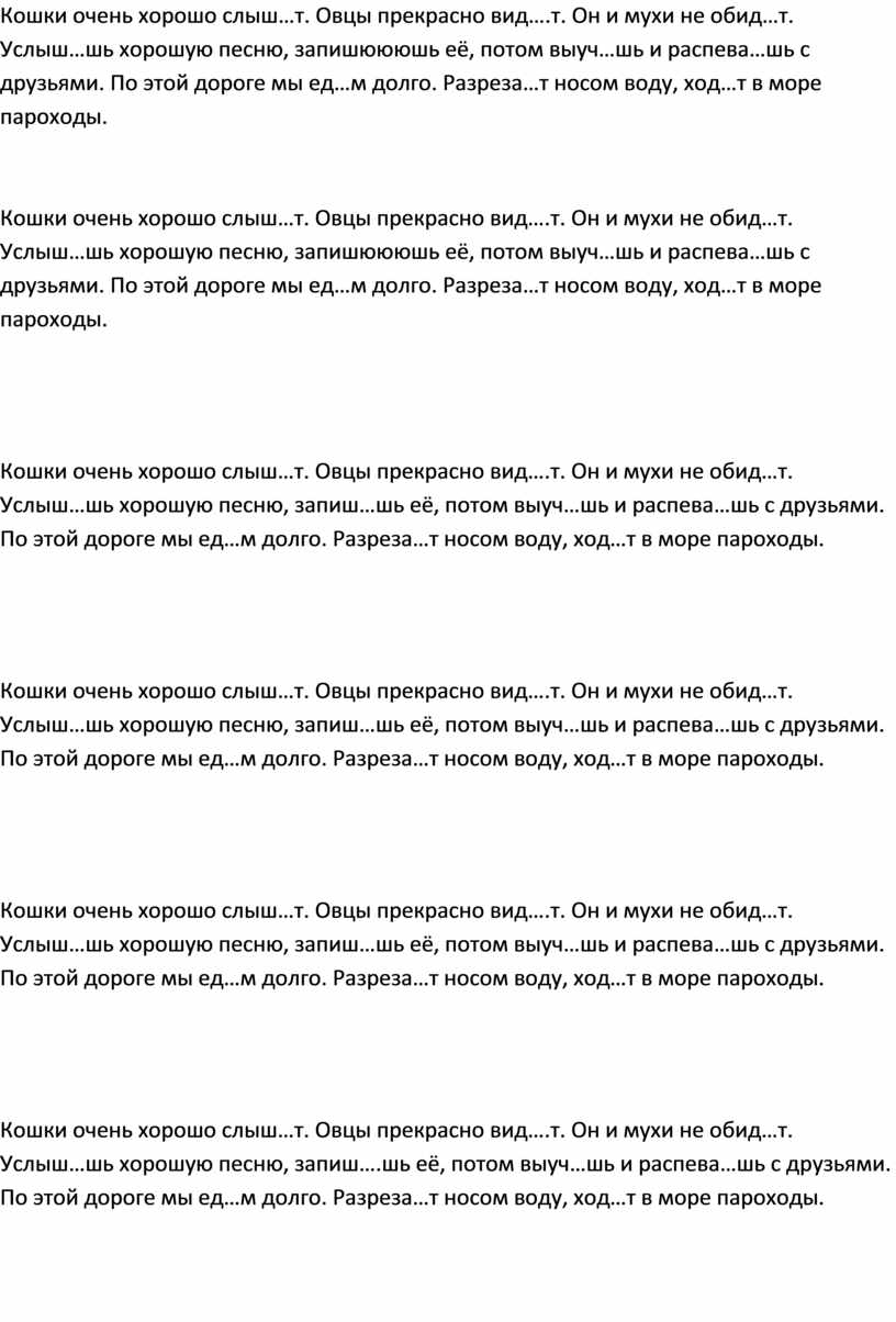 Кошки очень хорошо слыш…т. Овцы прекрасно вид….т. Он и мухи не обид…т. Услыш…шь хорошую песню, запишюююшь её, потом выуч…шь и распева…шь с друзьями. По этой дороге мы ед…м долго. Разреза…т носом воду, ход…т в море пароходы.