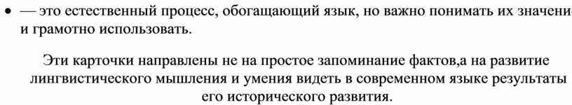Эти карточки направлены не на простое запоминание фактов, а на развитие лингвистического мышления и умения видеть в современном языке результаты его исторического развития.
