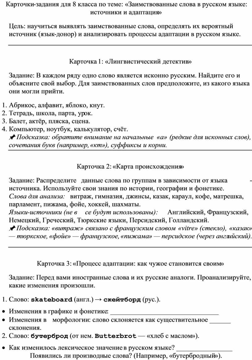 Цель: научиться выявлять заимствованные слова, определять их вероятный источник (язык-донор) и анализировать процессы адаптации в русском языке.