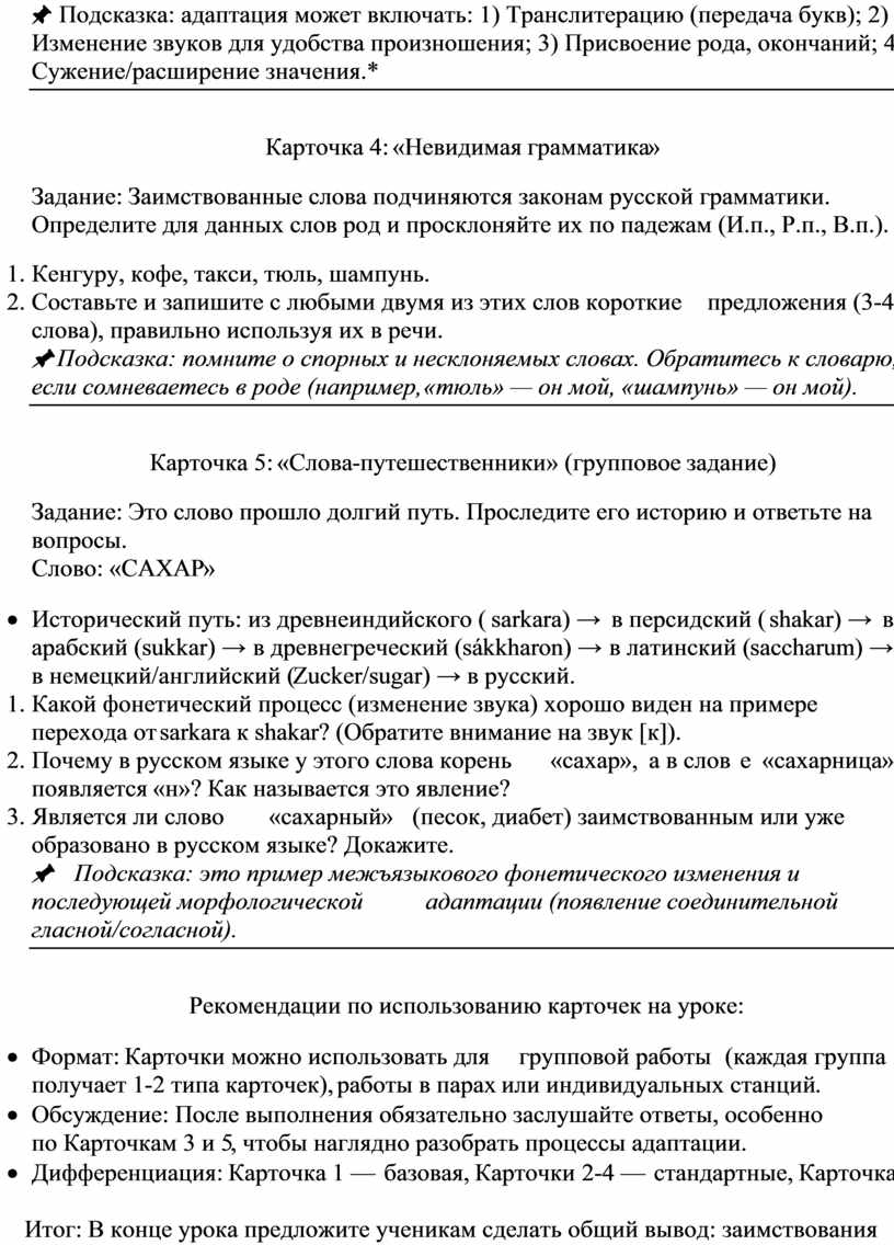 · Итог: В конце урока предложите ученикам сделать общий вывод: заимствования — это естественный процесс, обогащающий язык, но важно понимать их значение и грамотно использовать.