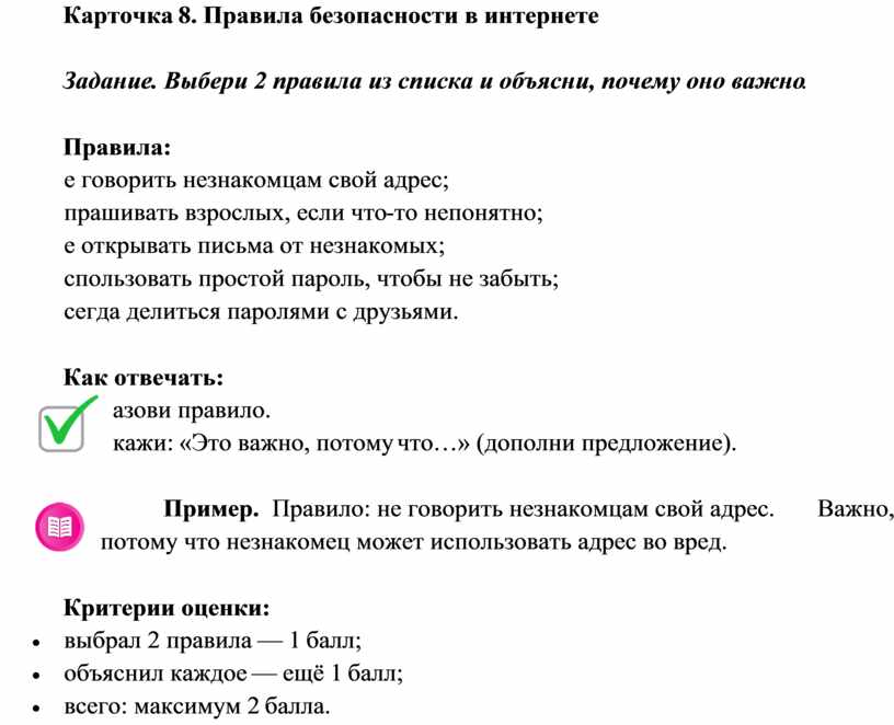 Задание. Выбери 2 правила из списка и объясни, почему оно важно.