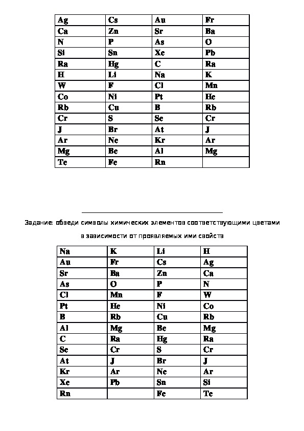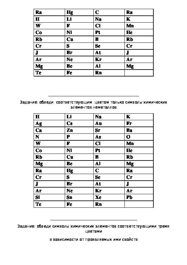 Задание: обведи символы химических элементов тремя цветами