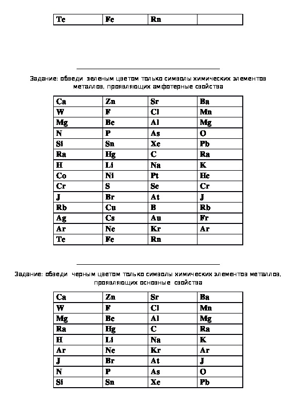 Задание: обведи черным цветом только символы химических элементов металлов,
