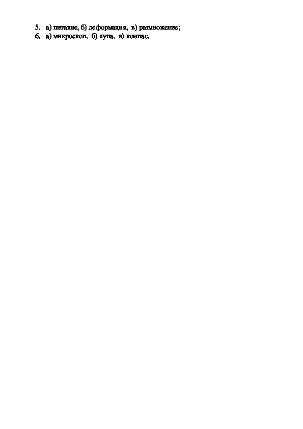 4. а) эвглена зеленая, б) инфузория – туфелька, в) речной рак;5. а) питание, б) деформация, в) размножение;