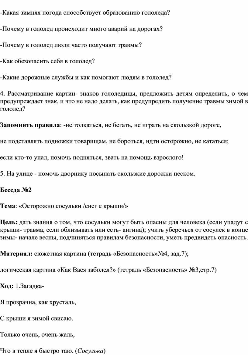 Цель: дать знания о том, что сосульки могут быть опасны для человека (если упадут с крыши- травма, если облизывать или есть- ангина); учить уберечься от сосулек в конце зимы- начале весны, подчиняться правилам безопасности, уметь предвидеть опасность.