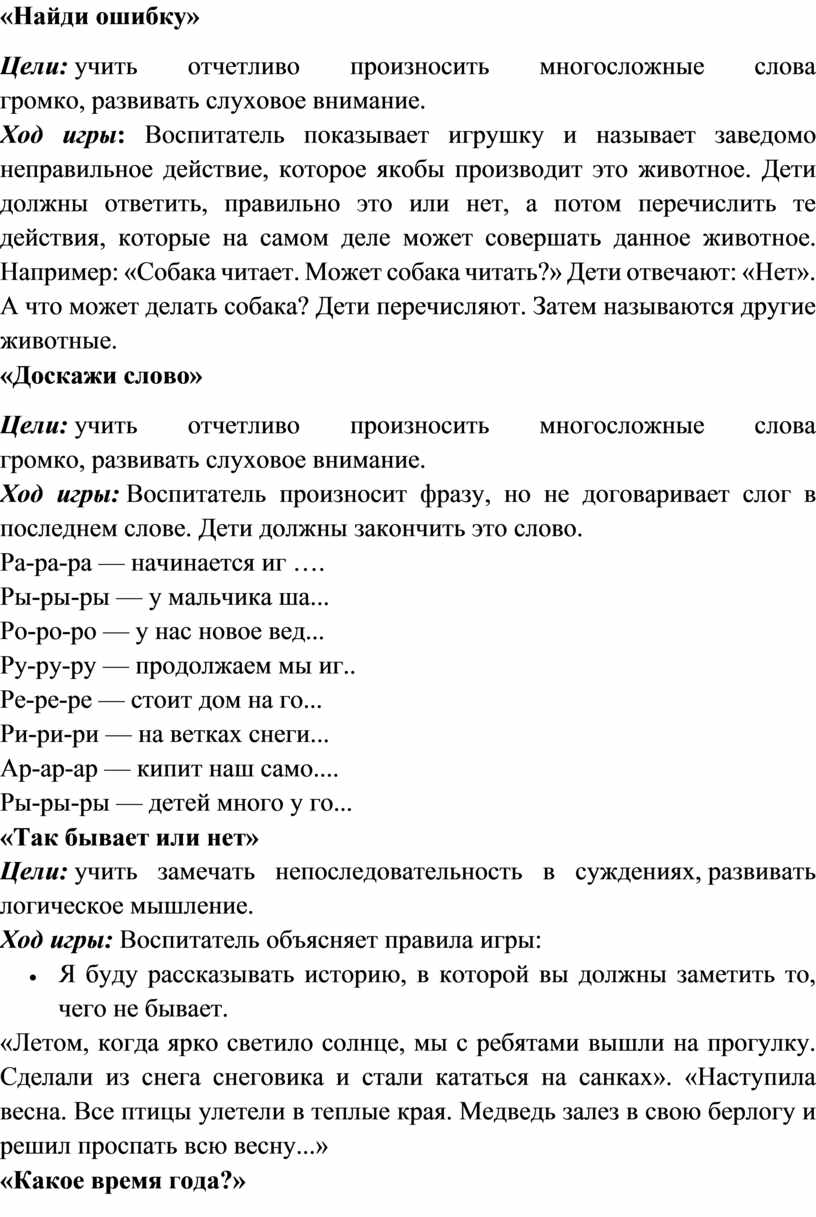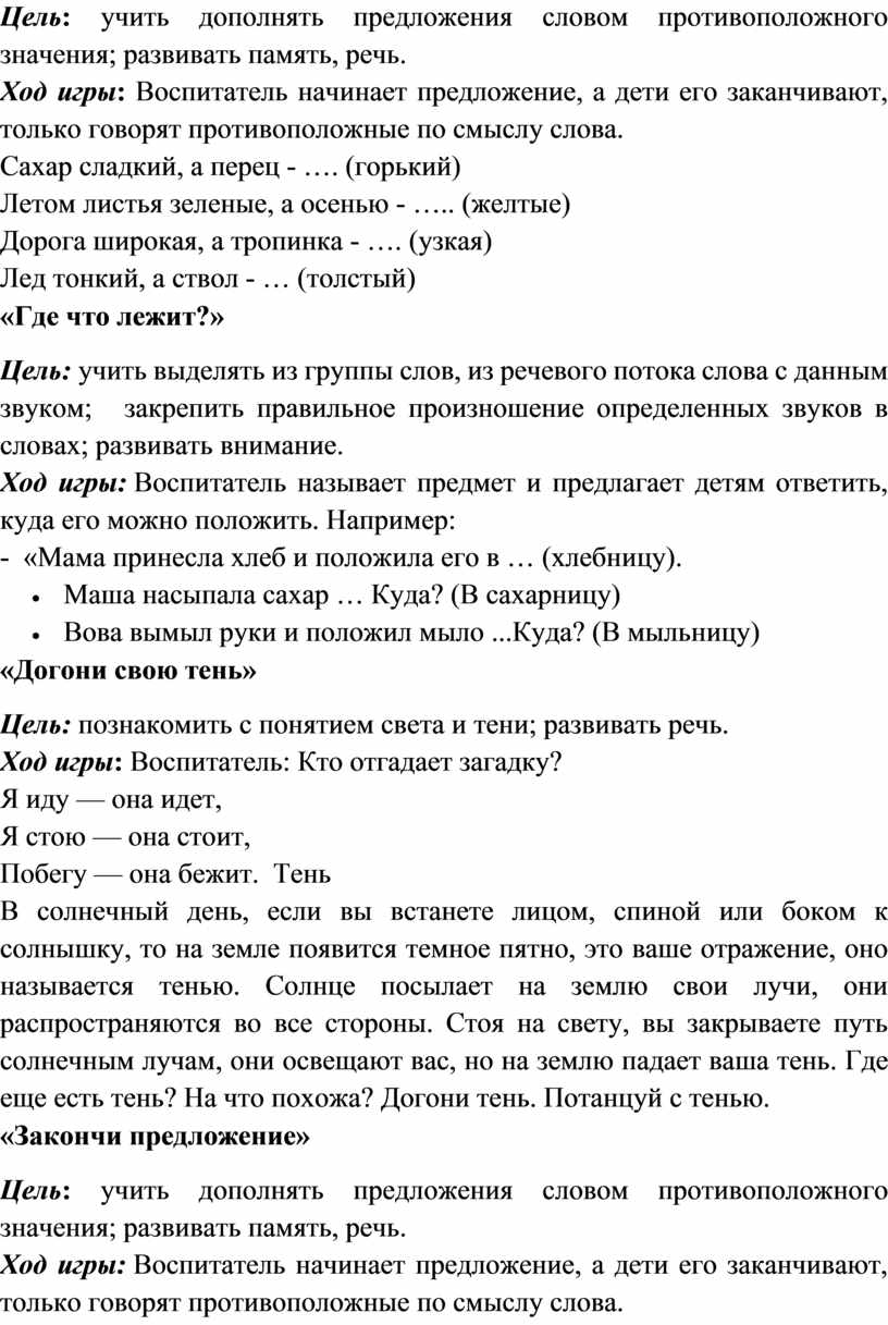 Воспитатель должен произносить слова медленно, после каждого слова делать паузу, чтобы дети могли подумать.