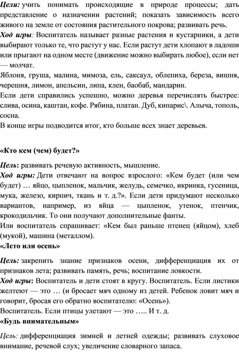 Ход игры: Ведущий произносит слова «Дерево, кустарник, цветок ...» и обходит детей. Останавливаясь, он указывает на ребенка и считает до трех, ребенок должен быстро назвать то, на чем остановился ведущий. Если ребенок не успел или неправильно назвал, он выбывает из игры. Игра продолжается до тех пор, пока не останется один игрок.