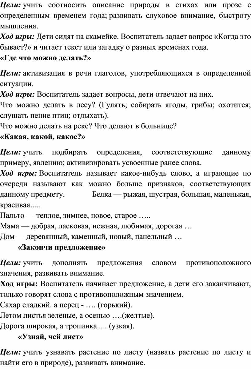 Цели: учить соотносить описание природы в стихах или прозе с определенным временем года; развивать слуховое внимание, быстроту мышления.
