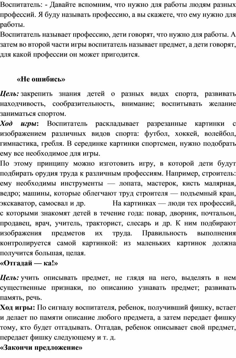 Воспитатель называет профессию, дети говорят, что нужно для работы. А затем во второй части игры воспитатель называет предмет, а дети говорят, для какой профессии он может пригодится.