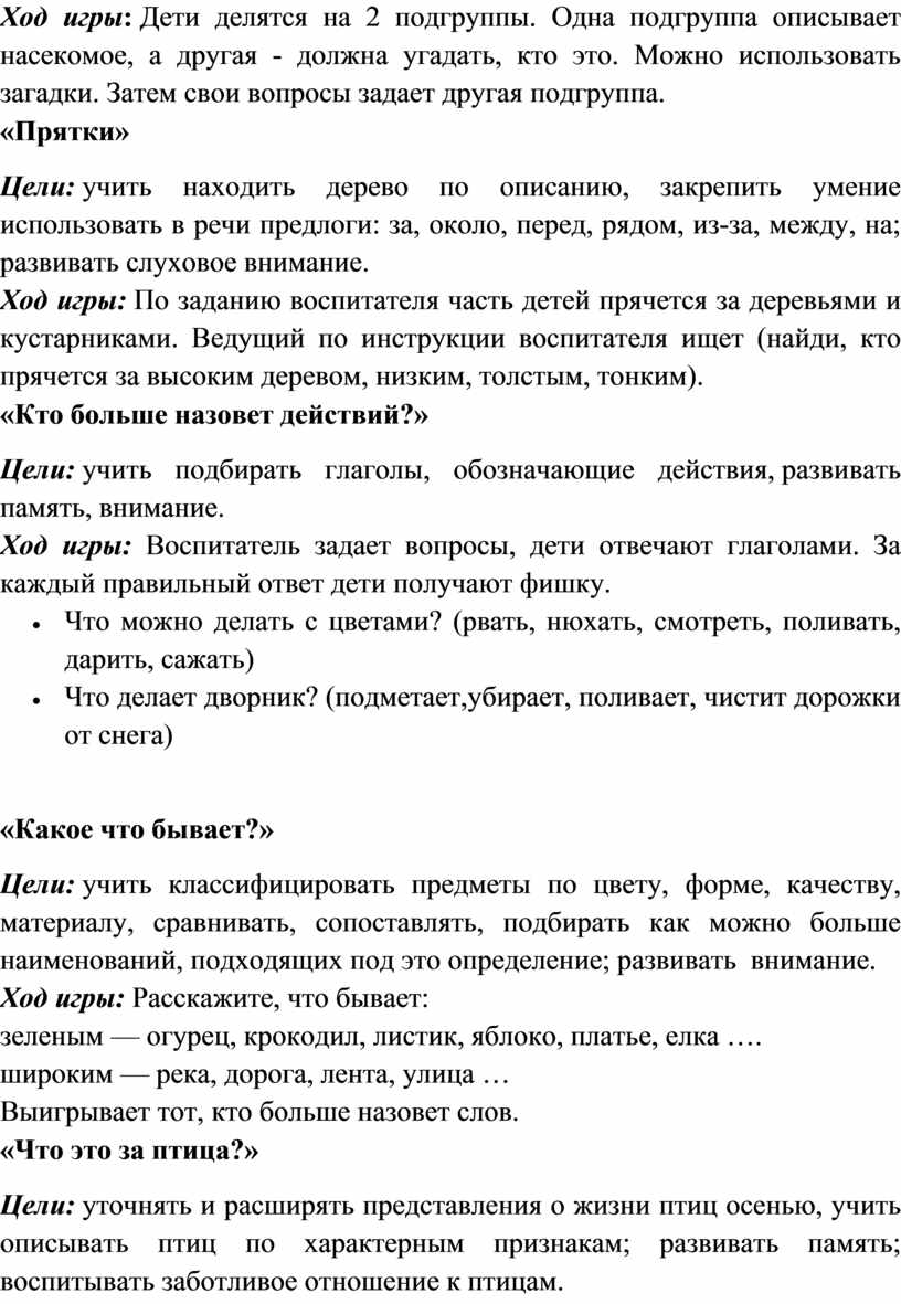 Цели: уточнять и расширять представления о жизни насекомых осенью, учить описывать насекомых по характерным признакам, воспитывать заботливое отношение ко всему живому, развивать внимание.