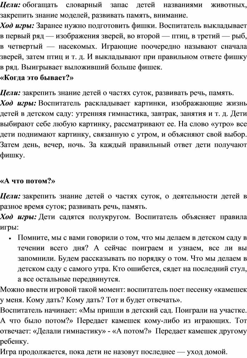Ход игры: Воспитатель называет одного ребенка. Потом изображает какое — нибудь действие, например, моет руки, чистит зубы, чистит обувь, причесывается и прочее, и спрашивает: «Когда ты это делаешь?» если ребенок отвечает, что чистит зубы утром, дети поправляют: «Утром и вечером». В роли ведущего может быть один из детей.