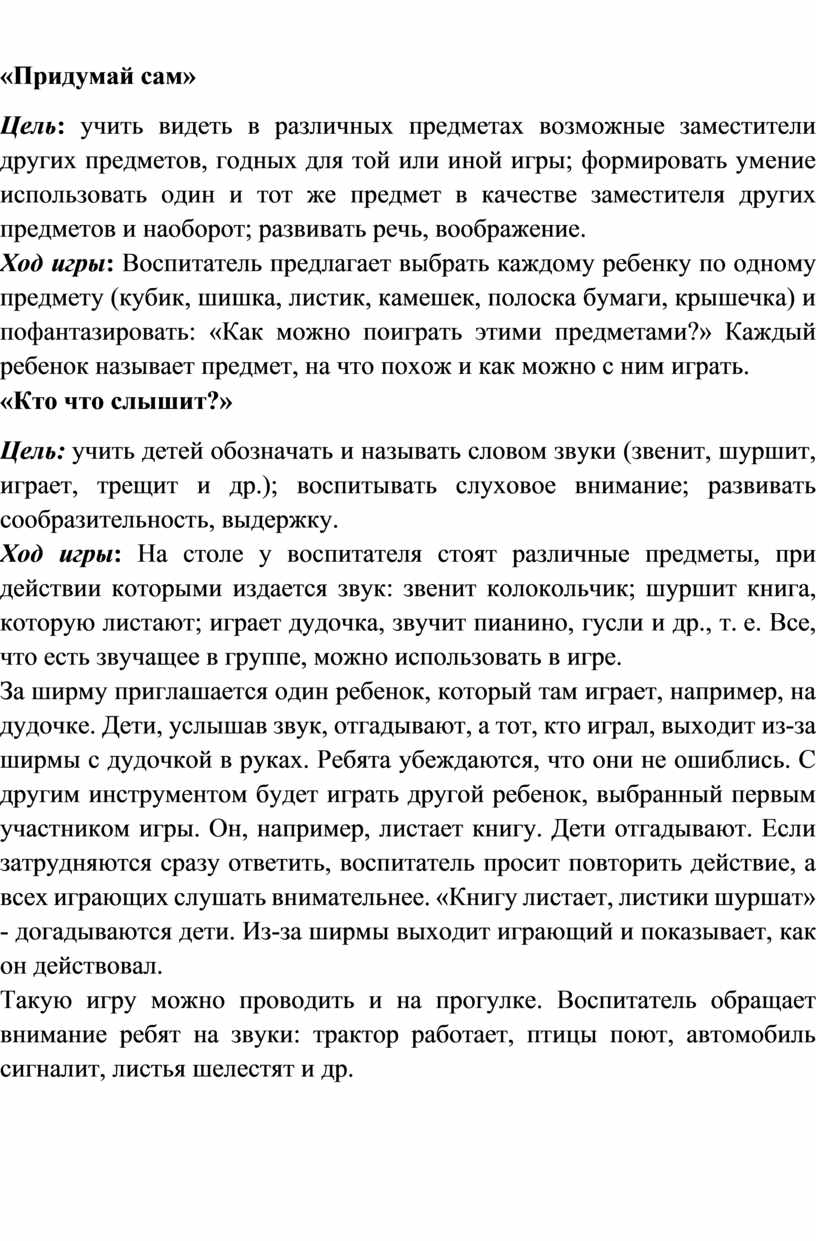 Цель: учить детей обозначать и называть словом звуки (звенит, шуршит, играет, трещит и др.); воспитывать слуховое внимание; развивать сообразительность, выдержку.