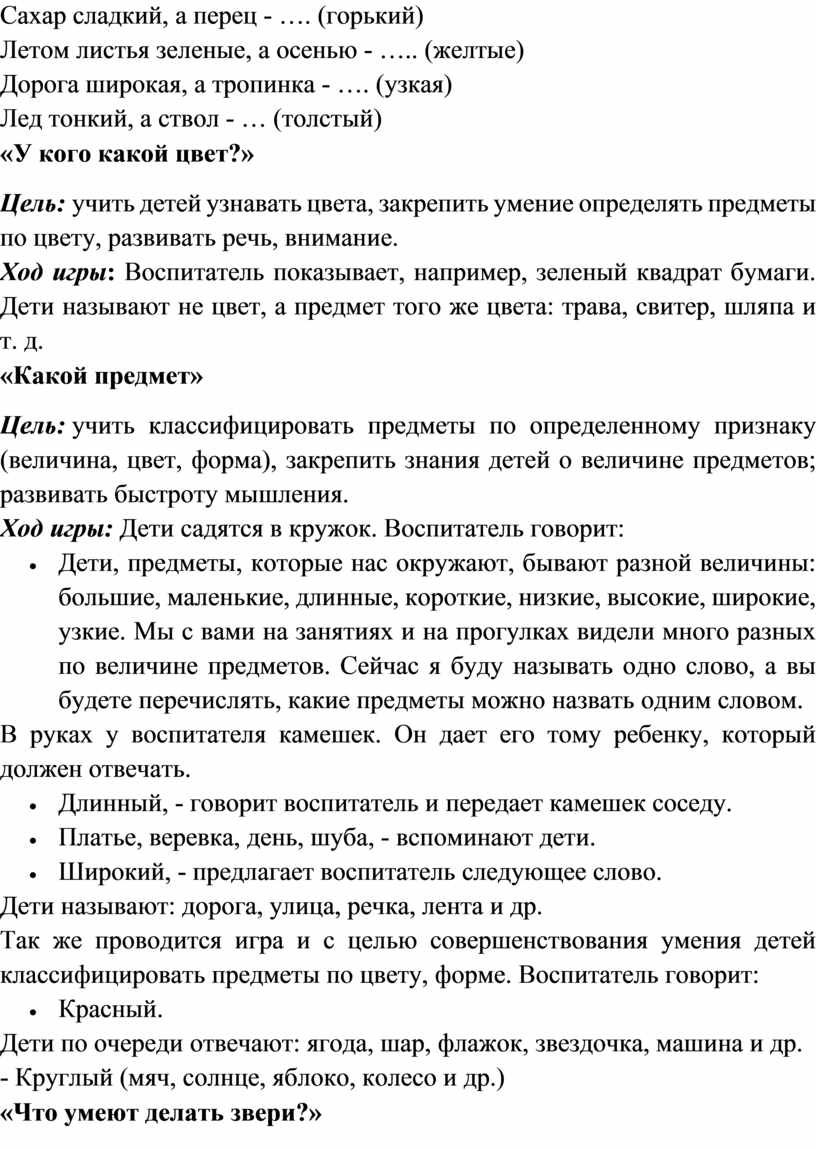 Ход игры: Воспитатель называет какое-нибудь слово, а играющие по очереди называют как можно больше признаков, соответствующих данному предмету. Белка — рыжая, шустрая, большая, маленькая, красивая.....