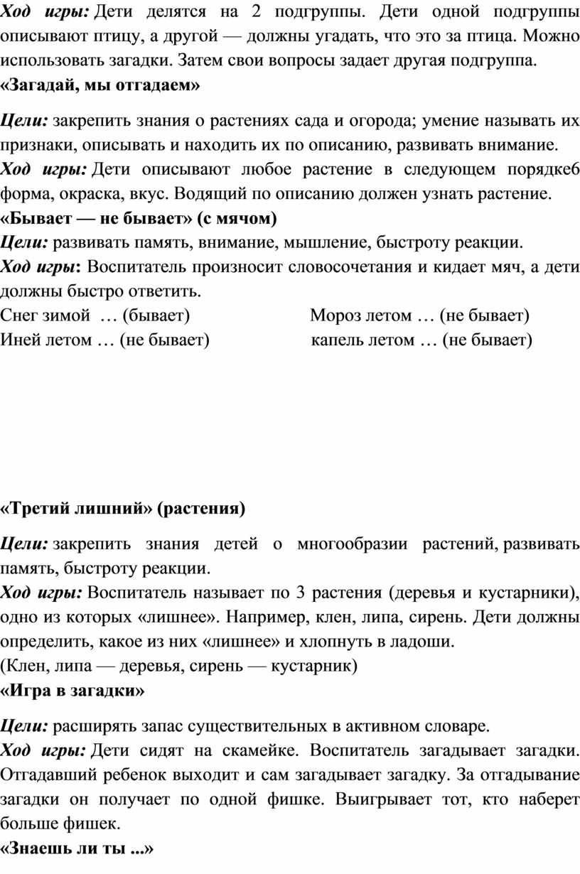 Ход игры: Воспитатель называет по 3 растения (деревья и кустарники), одно из которых «лишнее». Например, клен, липа, сирень. Дети должны определить, какое из них «лишнее» и хлопнуть в ладоши.
