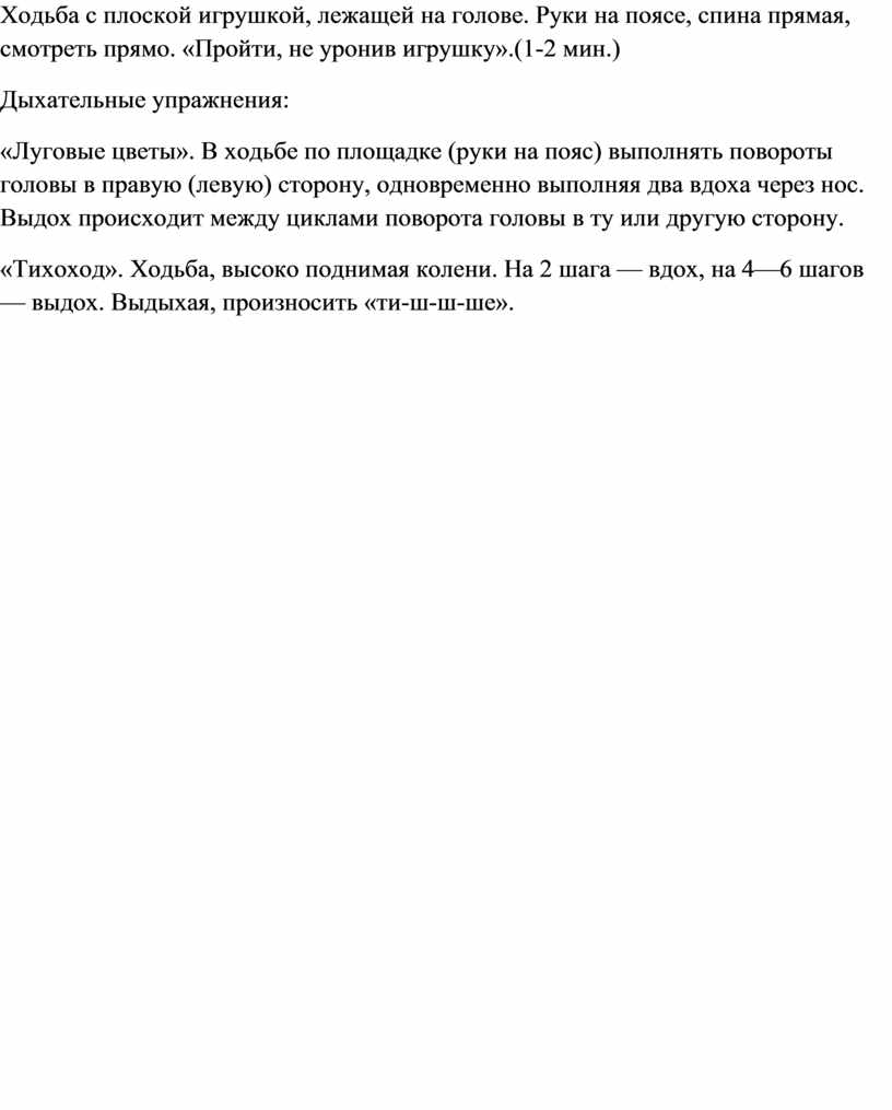 «Луговые цветы». В ходьбе по площадке (руки на пояс) выполнять повороты головы в правую (левую) сторону, одновременно выполняя два вдоха через нос. Выдох происходит между циклами поворота головы в ту или другую сторону.
