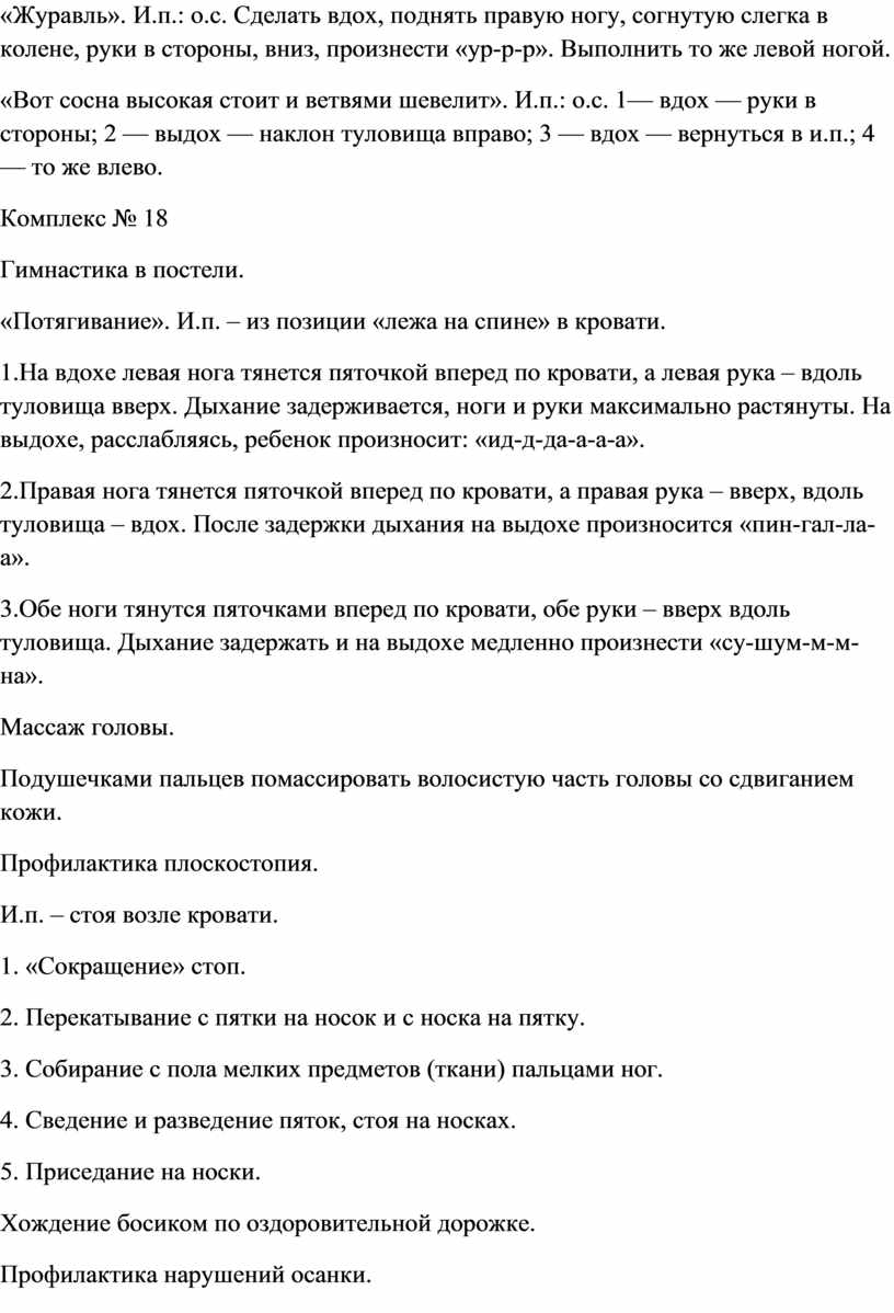 «Журавль». И.п.: о.с. Сделать вдох, поднять правую ногу, согнутую слегка в колене, руки в стороны, вниз, произнести «ур-р-р». Выполнить то же левой ногой.