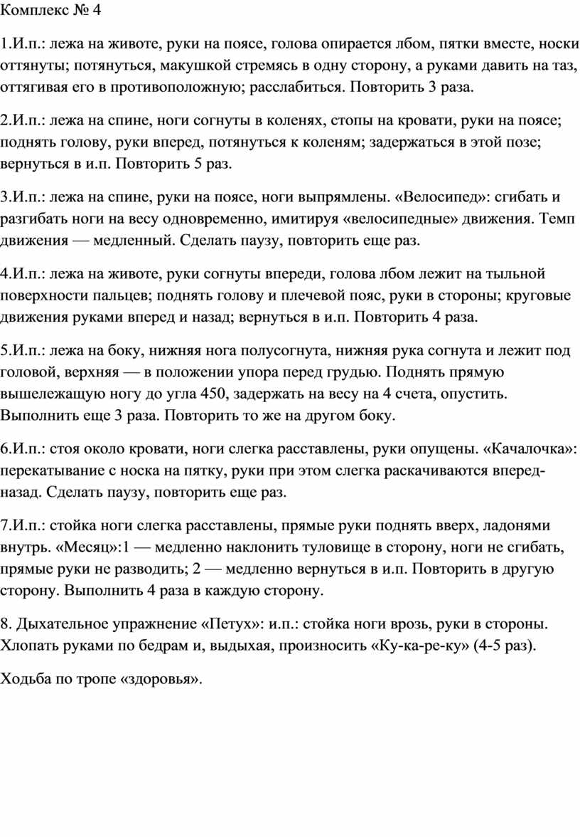 4.И.п.: то же. Поднимать ноги поочередно, не отрывая таза от кровати, 5-6 раз каждой ногой.