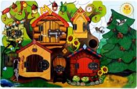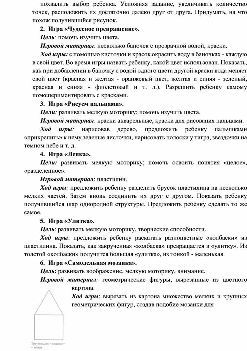 Ход игры: вырезать из картона множество мелких и крупных геометрических фигур, создав подобие мозаики для ребенка. Показать ребенку, как из фигурок можно делать картинки: если положить на одну сторону прямоугольника треугольник, то получится домик; три зеленых треугольника образуют елку; крут и два овала наверху - голову зайца и т. д. Нарисовать на бумаге схемы предметов, показать, как, опираясь на них, можно выложить ту или иную картинку.