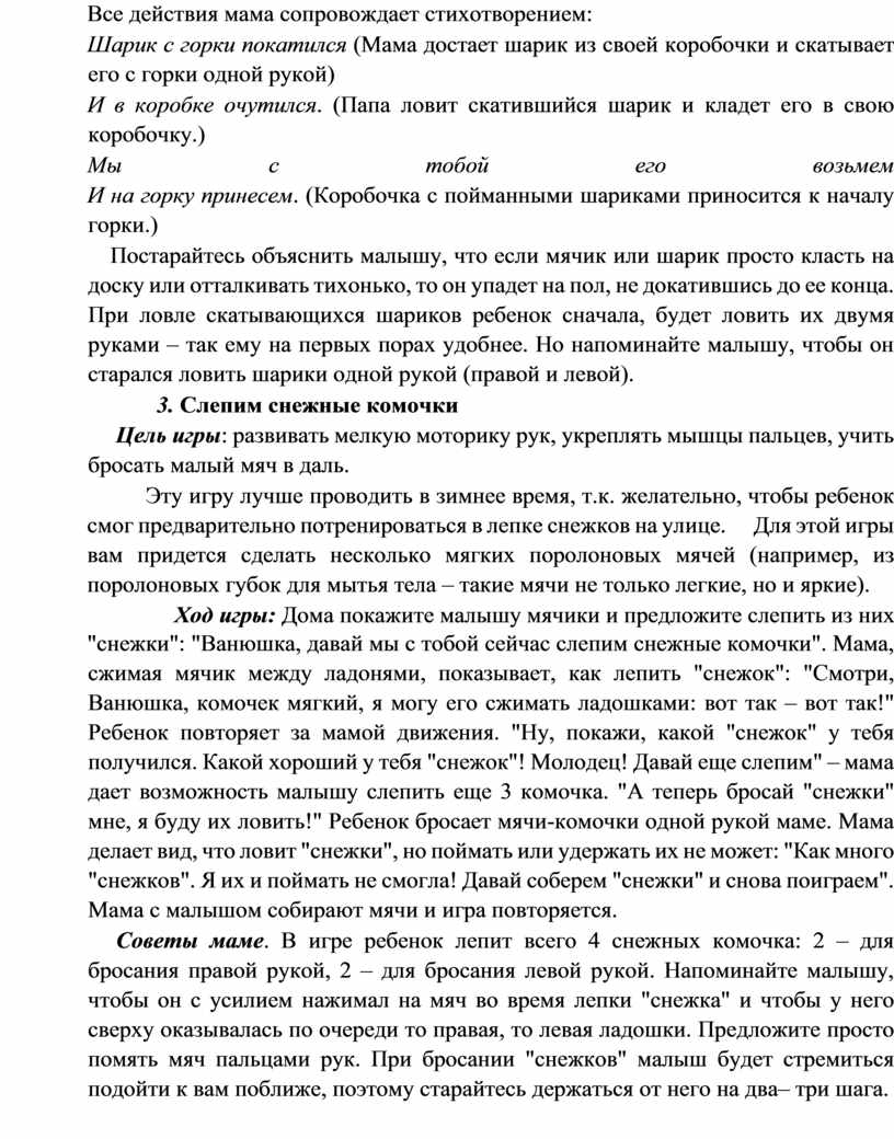 "снежки": "Ванюшка, давай мы с тобой сейчас слепим снежные комочки". Мама, сжимая мячик между ладонями, показывает, как лепить "снежок": "Смотри, Ванюшка, комочек мягкий, я могу его сжимать ладошками: вот так – вот так!" Ребенок повторяет за мамой движения. "Ну, покажи, какой "снежок" у тебя получился. Какой хороший у тебя "снежок"! Молодец! Давай еще слепим" – мама дает возможность малышу слепить еще 3 комочка. "А теперь бросай "снежки" мне, я буду их ловить!" Ребенок бросает мячи-комочки одной рукой маме. Мама делает вид, что ловит "снежки", но поймать или удержать их не может: "Как много "снежков". Я их и поймать не смогла! Давай соберем "снежки" и снова поиграем". Мама с малышом собирают мячи и игра повторяется.