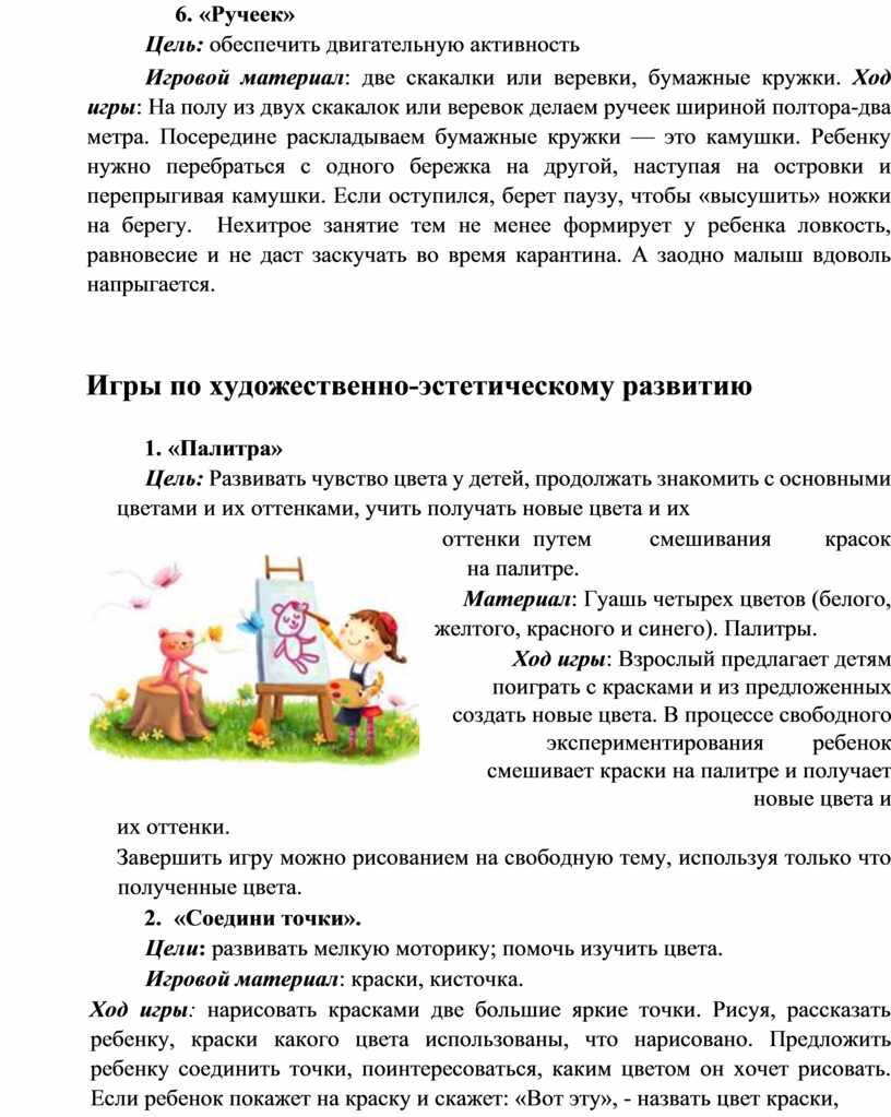 Игровой материал: две скакалки или веревки, бумажные кружки. Ход игры: На полу из двух скакалок или веревок делаем ручеек шириной полтора-два метра. Посередине раскладываем бумажные кружки — это камушки. Ребенку нужно перебраться с одного бережка на другой, наступая на островки и перепрыгивая камушки. Если оступился, берет паузу, чтобы «высушить» ножки на берегу. Нехитрое занятие тем не менее формирует у ребенка ловкость, равновесие и не даст заскучать во время карантина. А заодно малыш вдоволь напрыгается.