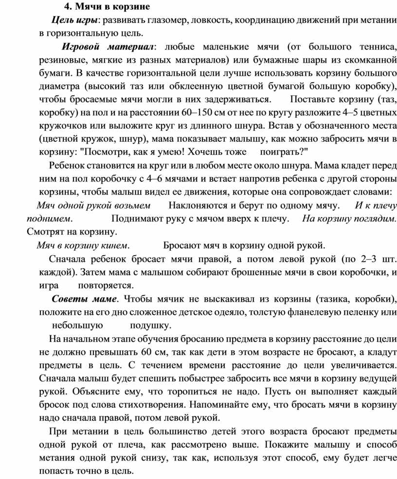 На начальном этапе обучения бросанию предмета в корзину расстояние до цели не должно превышать 60 см, так как дети в этом возрасте не бросают, а кладут предметы в цель. С течением времени расстояние до цели увеличивается. Сначала малыш будет спешить побыстрее забросить все мячи в корзину ведущей рукой. Объясните ему, что торопиться не надо. Пусть он выполняет каждый бросок под слова стихотворения. Напоминайте ему, что бросать мячи в корзину надо сначала правой, потом левой рукой.