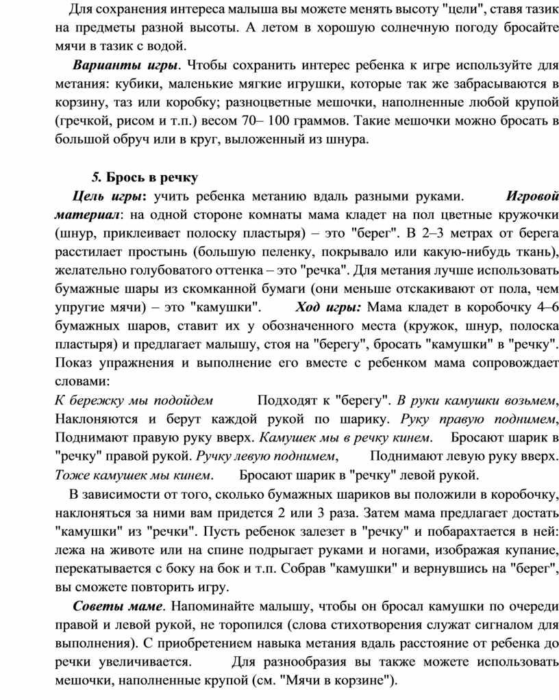 Советы маме. Напоминайте малышу, чтобы он бросал камушки по очереди правой и левой рукой, не торопился (слова стихотворения служат сигналом для выполнения). С приобретением навыка метания вдаль расстояние от ребенка до речки увеличивается. Для разнообразия вы также можете использовать мешочки, наполненные крупой (см. "Мячи в корзине").