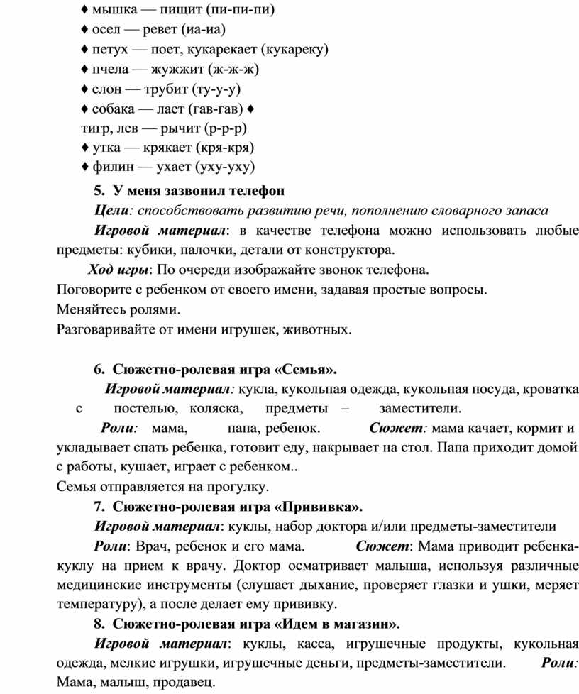 Роли: мама, папа, ребенок. Сюжет: мама качает, кормит и укладывает спать ребенка, готовит еду, накрывает на стол. Папа приходит домой с работы, кушает, играет с ребенком..