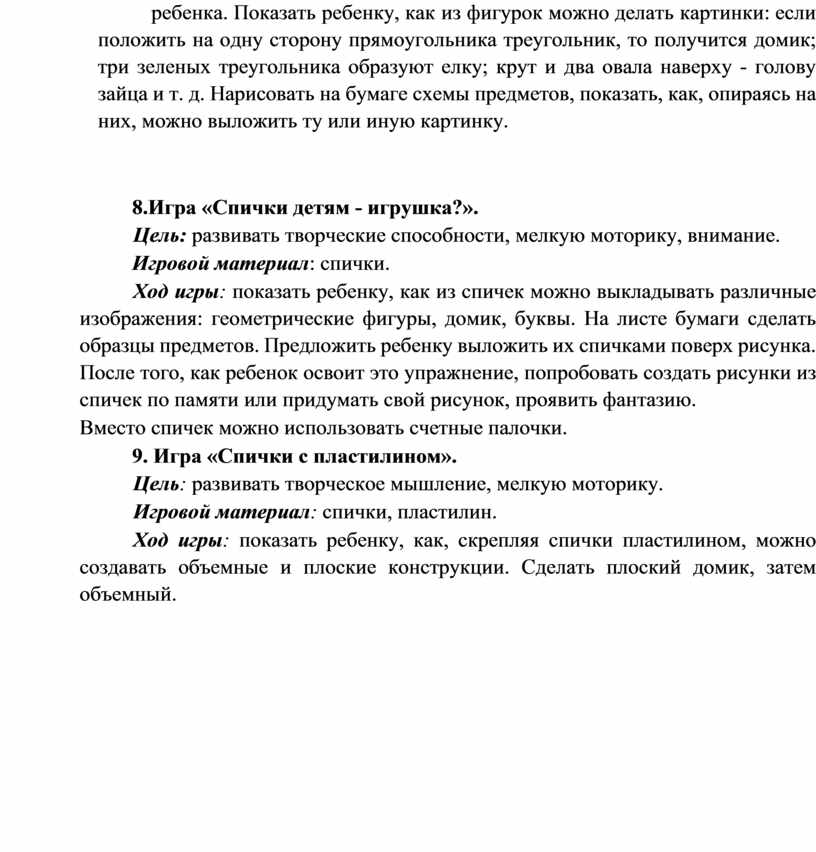 Ход игры: показать ребенку, как, скрепляя спички пластилином, можно создавать объемные и плоские конструкции. Сделать плоский домик, затем объемный.