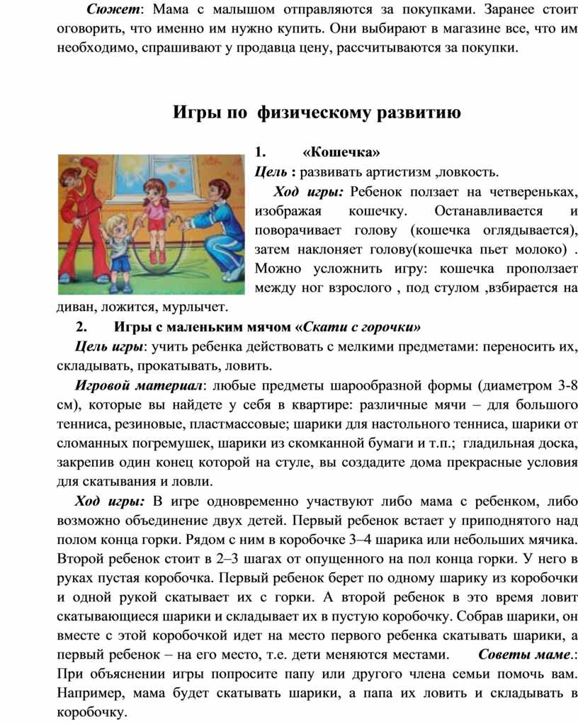 Игровой материал: любые предметы шарообразной формы (диаметром 3-8 см), которые вы найдете у себя в квартире: различные мячи – для большого тенниса, резиновые, пластмассовые; шарики для настольного тенниса, шарики от сломанных погремушек, шарики из скомканной бумаги и т.п.; гладильная доска, закрепив один конец которой на стуле, вы создадите дома прекрасные условия для скатывания и ловли.