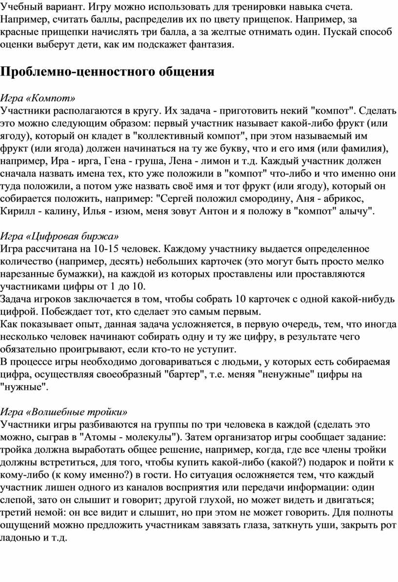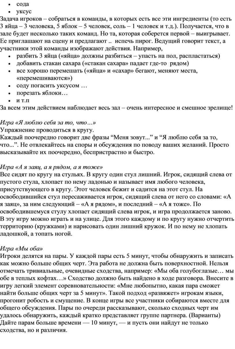 Игроки делятся на пары. У каждой пары есть 5 минут, чтобы обнаружить и записать как можно больше общих черт. Эта работа не должна быть поверхностной. Нельзя отмечать тривиальные, очевидные сходства, например: «Мы оба голубоглазые… мы обе в теплых кофтах…» Сходство должно быть найдено в ходе разговора. Внесите в игру легкий элемент соревновательности: «Мне любопытно, какая пара сможет найти больше общих черт за 5 минут». Такой подход «развяжет» игрокам языки, прогонит робость и смущение. В конце игры все участники собираются вместе для общего обсуждения. Пары по очереди рассказывают, сколько сходных черт им удалось обнаружить, каждый кратко представляет группе партнера. (Варианты) Дайте парам больше времени — 10 минут, — и пусть они найдут не только сходства, но и различия.