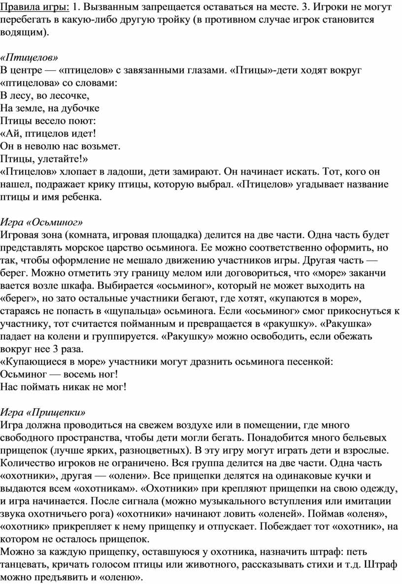 Правила игры: 1. Вызванным запрещается оставаться на месте. 3. Игроки не могут перебегать в какую-либо другую тройку (в противном случае игрок становится водящим).