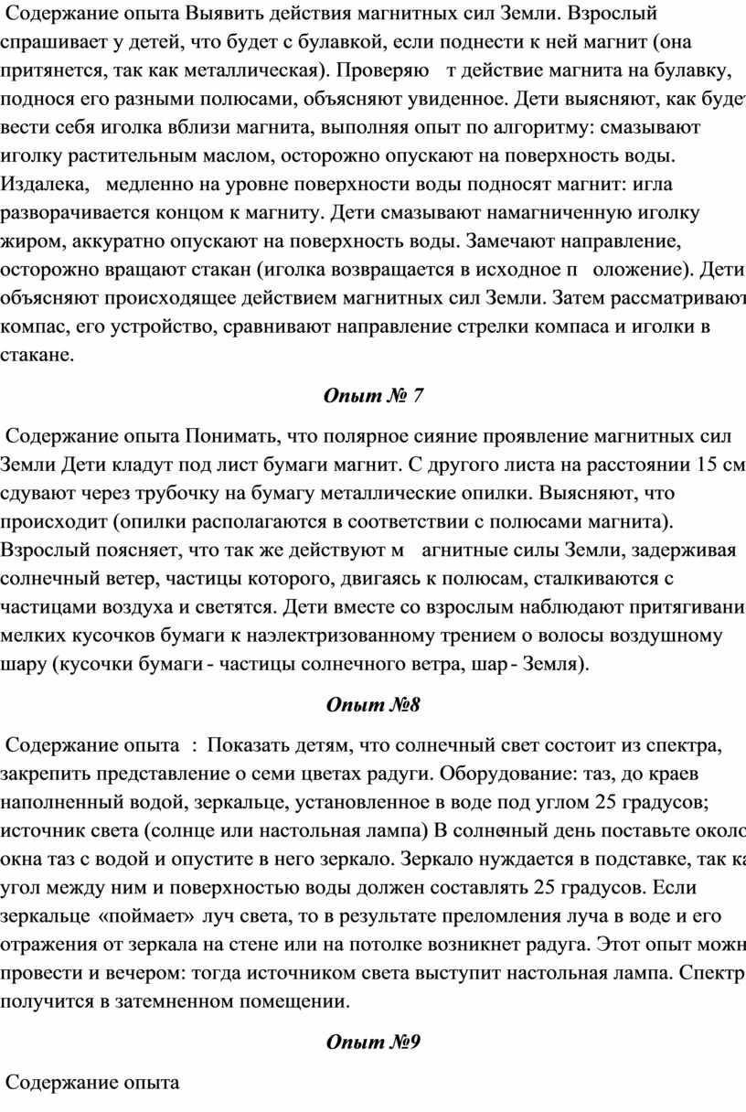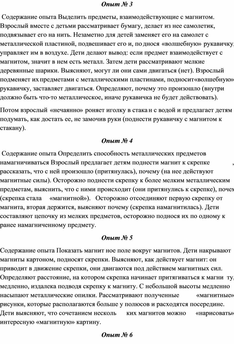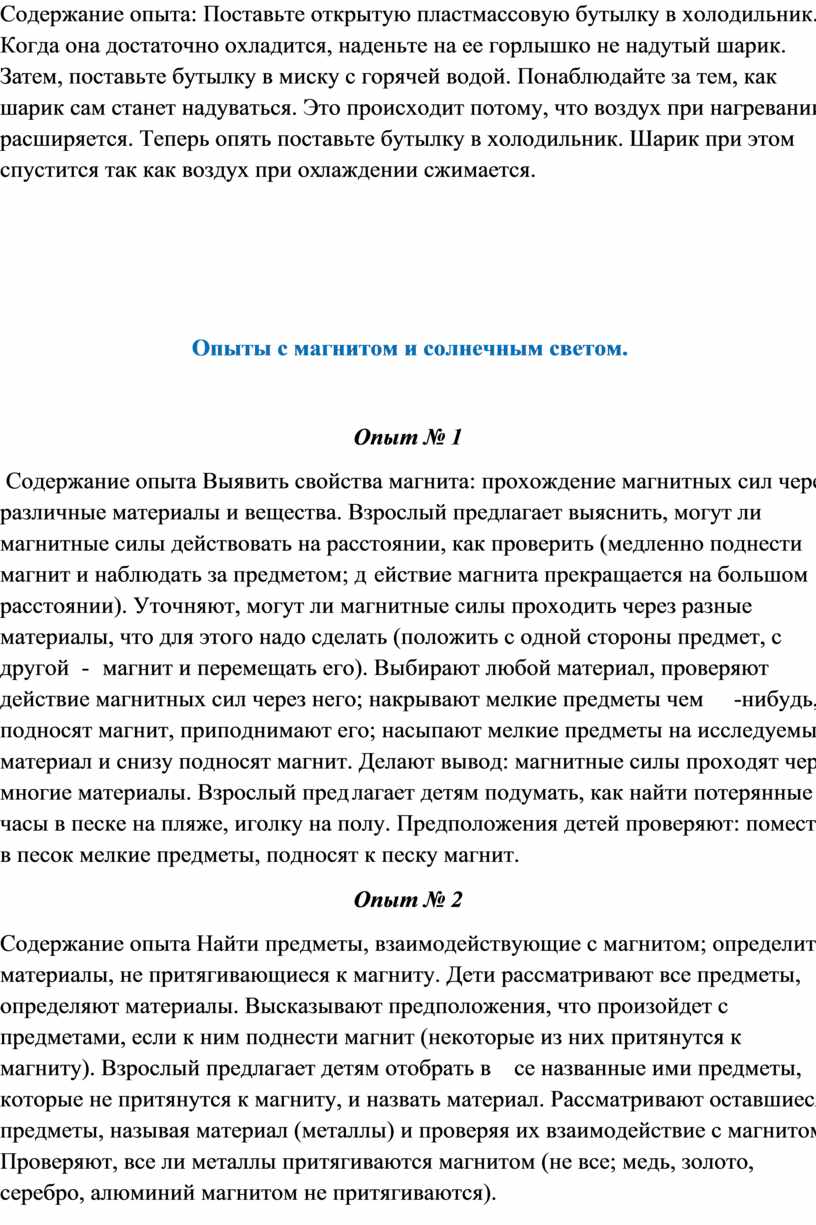Содержание опыта Выявить свойства магнита: прохождение магнитных сил через различные материалы и вещества. Взрослый предлагает выяснить, могут ли магнитные силы действовать на расстоянии, как проверить (медленно поднести магнит и наблюдать за предметом; действие магнита прекращается на большом расстоянии). Уточняют, могут ли магнитные силы проходить через разные материалы, что для этого надо сделать (положить с одной стороны предмет, с другой - магнит и перемещать его). Выбирают любой материал, проверяют действие магнитных сил через него; накрывают мелкие предметы чем-нибудь, подносят магнит, приподнимают его; насыпают мелкие предметы на исследуемый материал и снизу подносят магнит. Делают вывод: магнитные силы проходят через многие материалы. Взрослый предлагает детям подумать, как найти потерянные часы в песке на пляже, иголку на полу. Предположения детей проверяют: поместив в песок мелкие предметы, подносят к песку магнит.