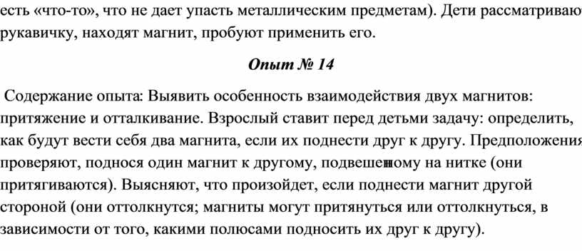 Содержание опыта: Выявить особенность взаимодействия двух магнитов: притяжение и отталкивание. Взрослый ставит перед детьми задачу: определить, как будут вести себя два магнита, если их поднести друг к другу. Предположения проверяют, поднося один магнит к другому, подвешенному на нитке (они притягиваются). Выясняют, что произойдет, если поднести магнит другой стороной (они оттолкнутся; магниты могут притянуться или оттолкнуться, в зависимости от того, какими полюсами подносить их друг к другу).